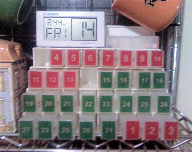 Each day is numbered with the date, allowing dispensing of different daily meds depending on the day, for meds that may not be taken dailly.