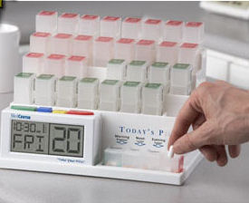The MedCenter System has a high visibility clock that not only helps to keep us day and date oriented but offers an optional talking alarm that can issue an audible reminder to take our meds, for those of us who can use a gentle reminder.